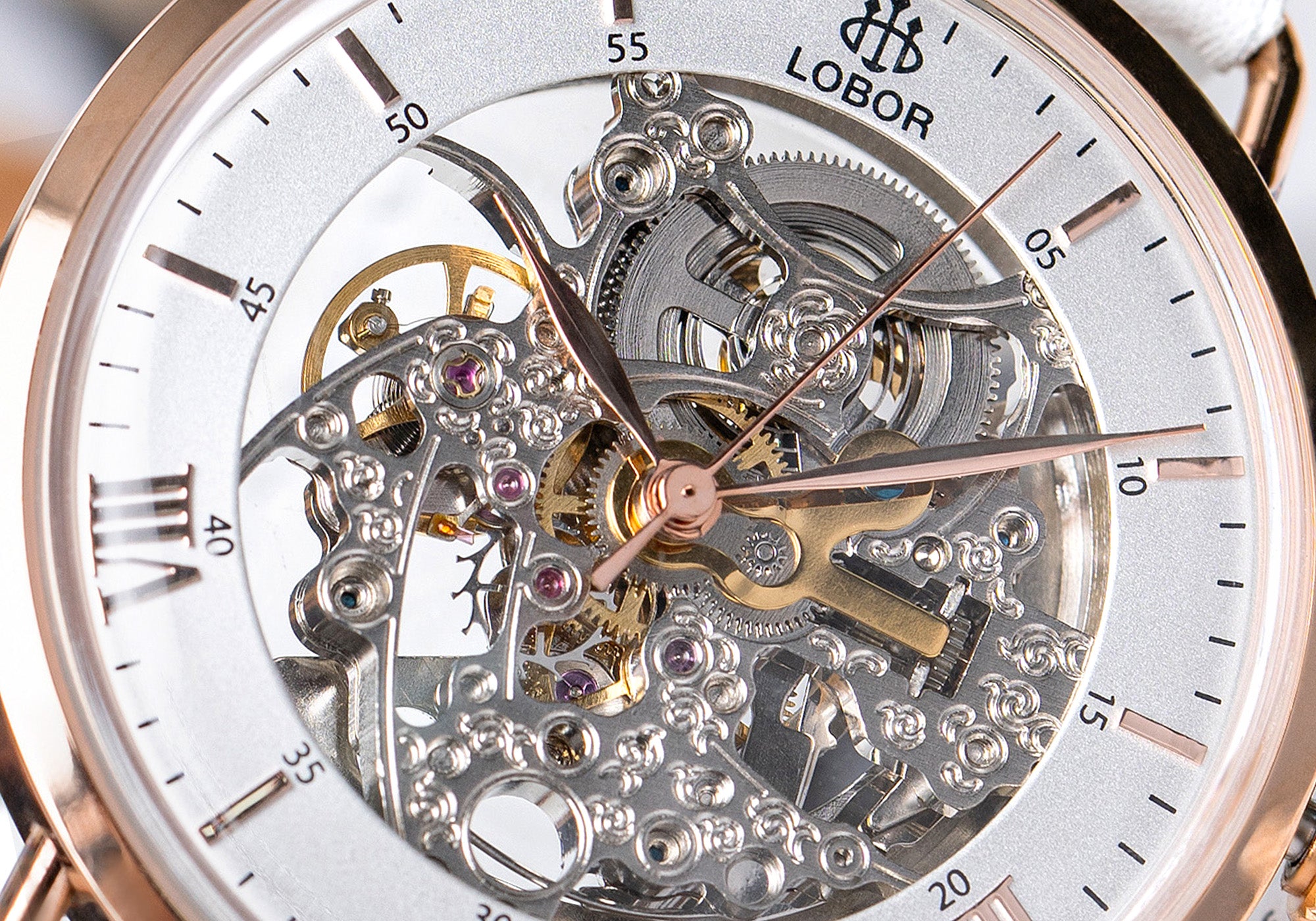 The domed acrylic lens creates depth and clarity, drawing attention to the skeletonized movement beneath. Its transparency highlights the watch’s intricate craftsmanship and layered design.